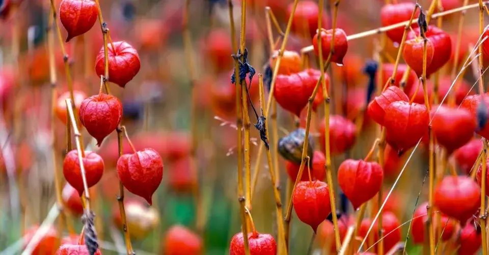 Plody mochyně židovské třešně (Physalis alkekengi) jsou obklopeny postupně se rozkládajícími červenými kališními listy, které časem vytvoří jemnou síť.