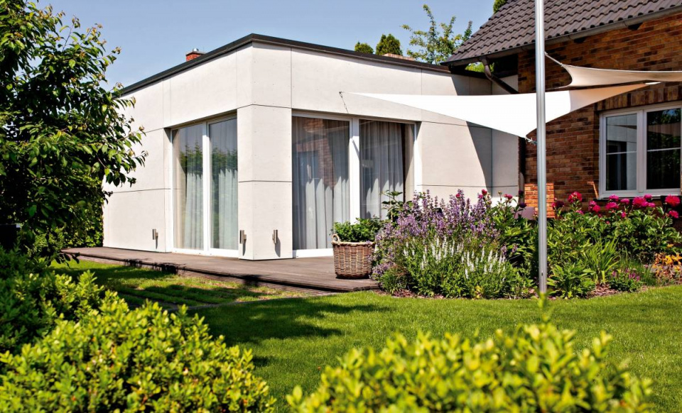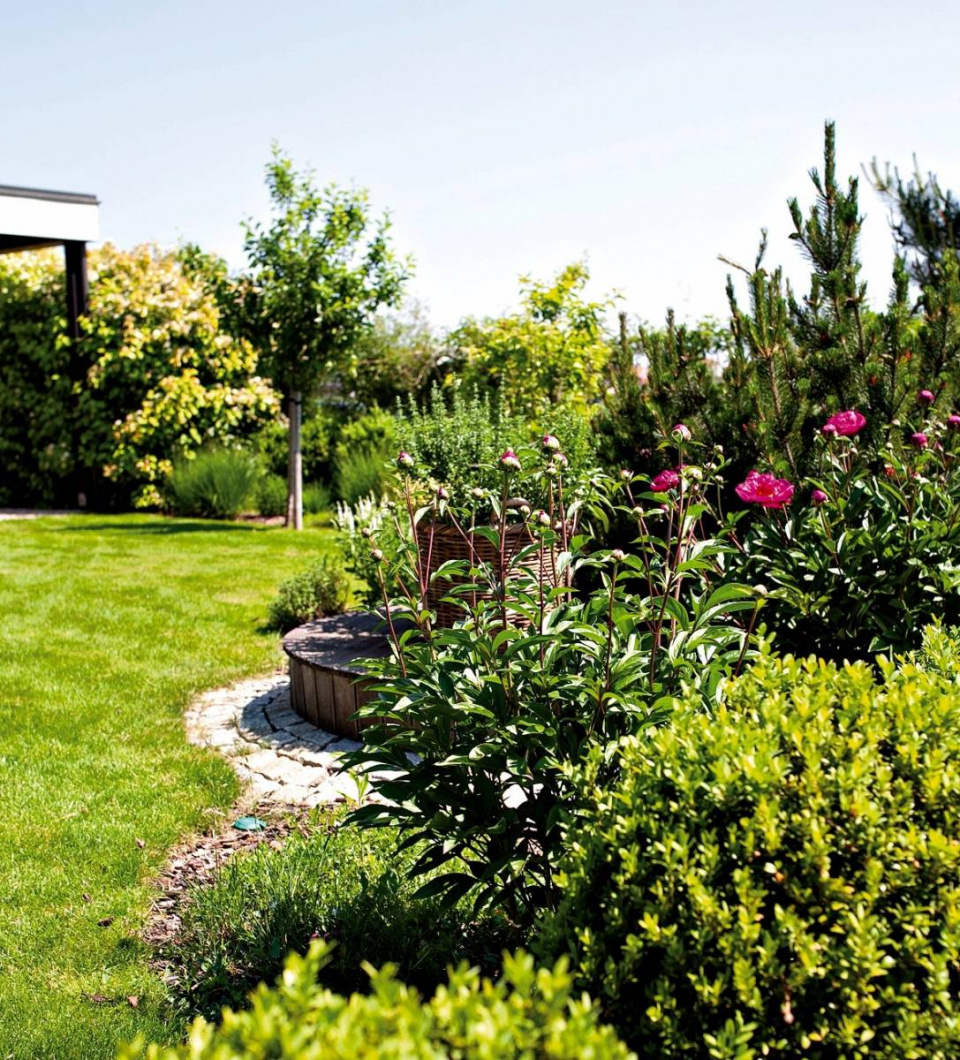 Začátek léta patří na zahradě pivoňkám, které krásně vyniknou mezi šalvějemi a levandulemi. Přístavbu domu obývají rodiče majitele.