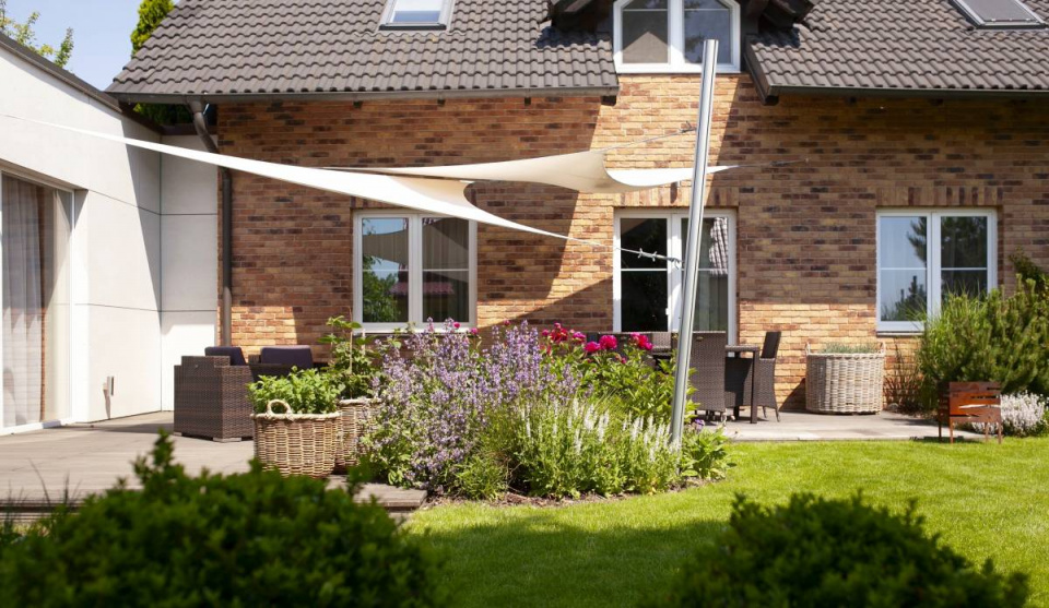 Terasu doplňují rostliny vysazené v nádobách a bylinky v koších.