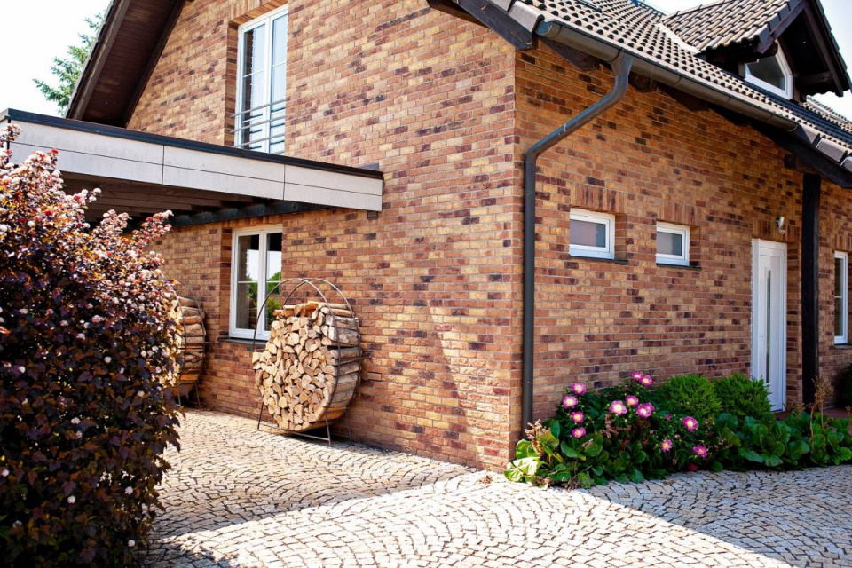 Dům z tmavých neomítnutých cihel tvoří spolu se zahradou harmonický celek.