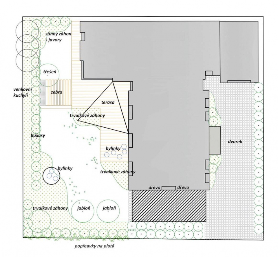 Plánek zahrady, ve kterém už jsou zakomponovány změny, které v předchozích letech udělal zahradník.