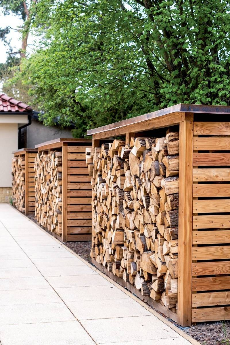Ohniště je nedaleko... Dřevníky tak zároveň skrývají zásobu paliva a tvoří optický předěl.