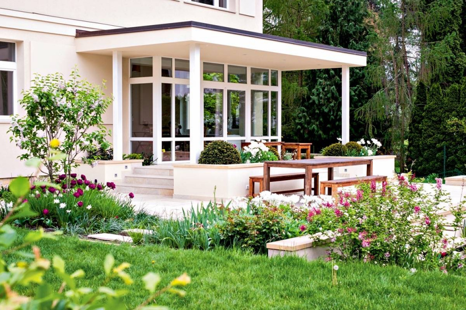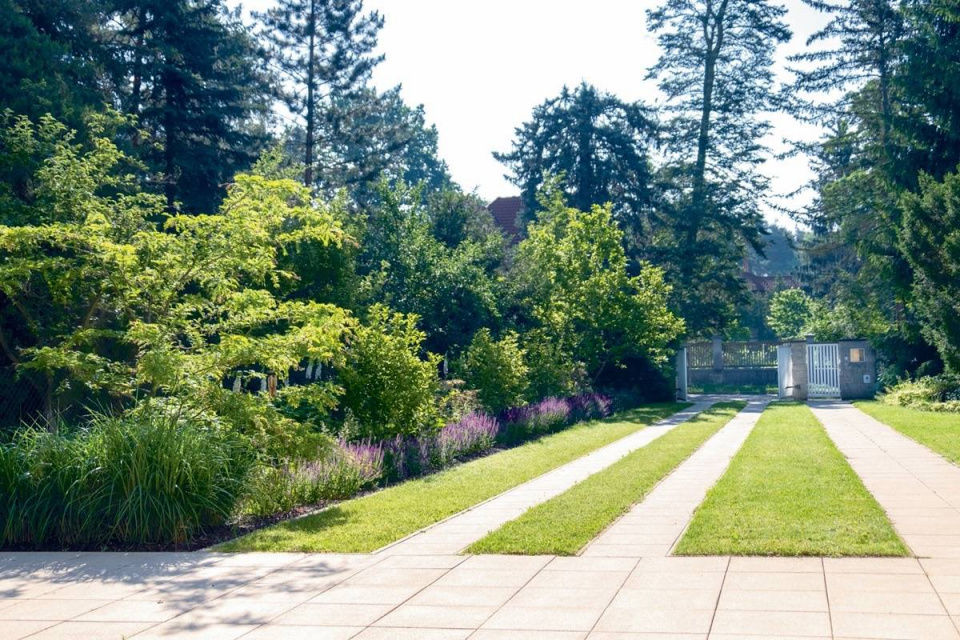 Široké koleje z dlaždic v barvě pískovce lemuje dlouhý záhon: na jaře bílý, v létě modrofialový.