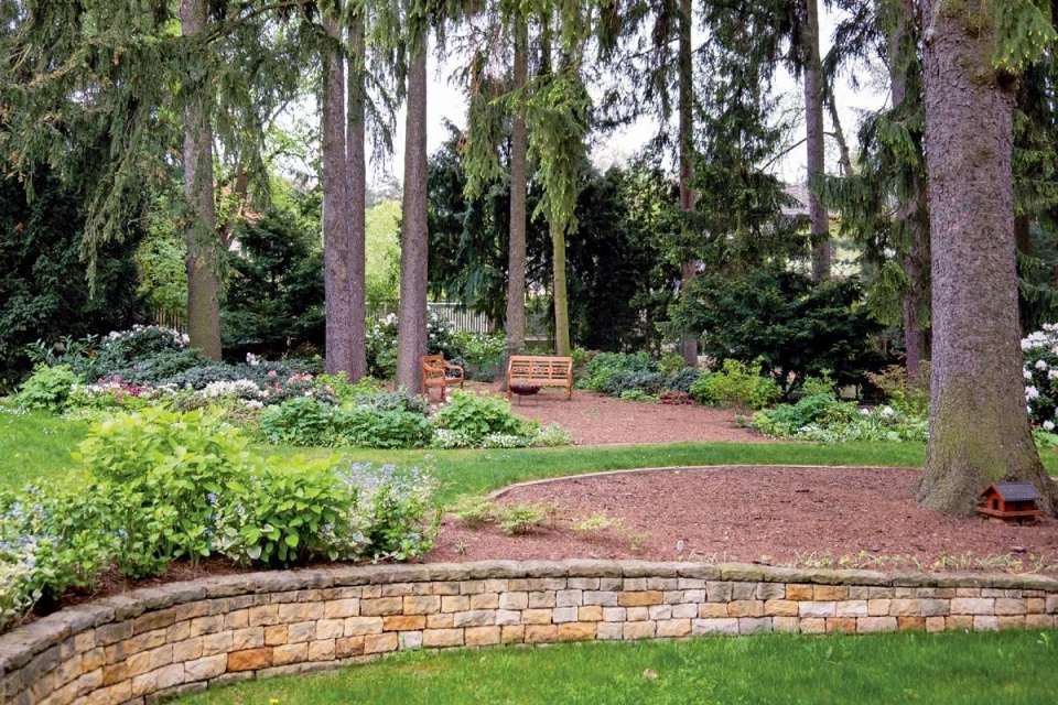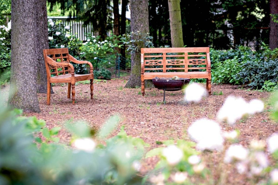 Mezi jehličnany – ale mimo stín korun a oblast kořenů – zbylo v lesní části zahrady místo pro malé ohniště s posezením.