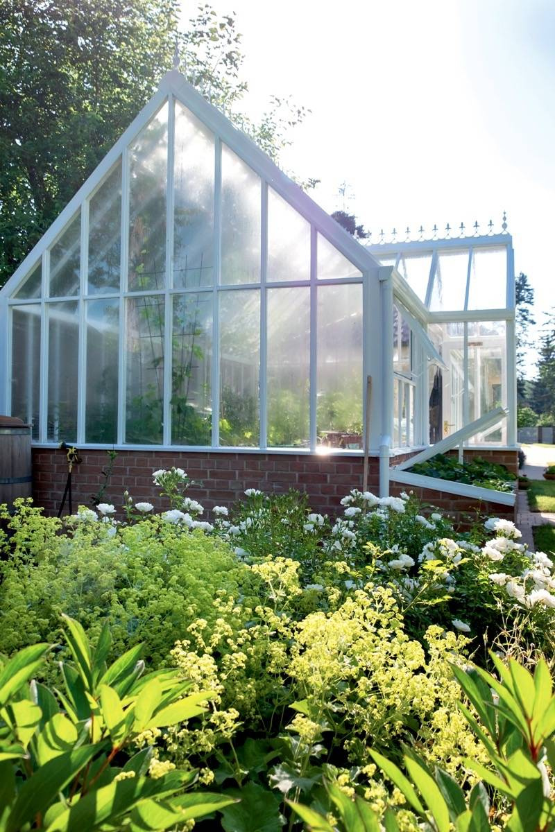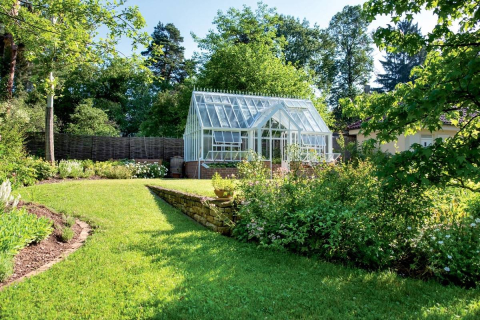 Skleník o rozměrech zhruba 4 x 6 m tu není jen pro ozdobu. Je v něm všechno, co je potřeba: záhonky na zeleninu a ovoce i stůl pro zpracování úrody včetně dřezu s pitnou vodou.