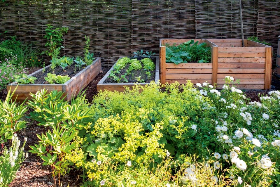 Součástí užitkové zahrady jsou vyvýšené záhony a dvoukójový dřevěný kompost.