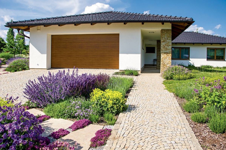 Plochy, které musí snést největší zátěž – cesta k domovním dveřím a stání pro auto – jsou zpevněny dlažebními kostkami.