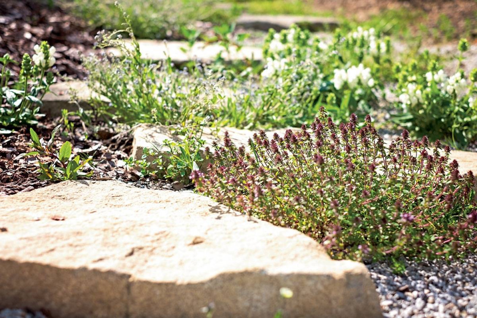 V místech, kudy se chodí, je souvislý chodník z kamenů. Tam, kde stačí přejít jen občas, se střídají nášlapné kameny a rostliny, kterým nevadí občasné sešlápnutí.