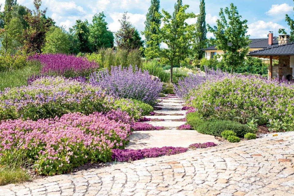 V létě se záhony vyladí do růžovofialových odstínů. Kvetou tu šalvěje, kakosty, dobromysl a nízké mateřídoušky a zběhovce.