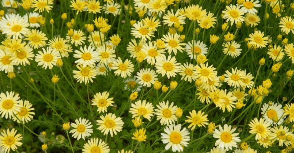 Aromatický rmen barvířský (Anthemis tinctoria) odrůdy ’E. C. Buxton’ prospívá na slunných místech s chudou propustnou půdou a kvete vytrvale od června až do září.