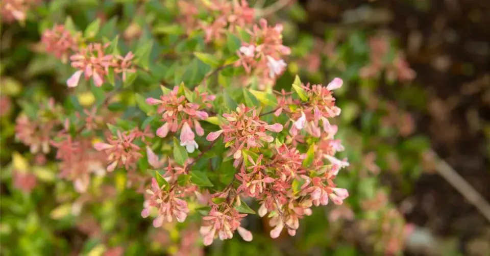 Abélie velkokvětá (Abelia grandiflora) obohatí každou zahradu, neboť její bílé až růžové květy se otevírají od léta až do podzimu. Kompaktně rostou např. ’Pinky Bells’, ’Sunshine Daydream’ (na fotce), ’Sherwood’, ’Compacta’ nebo ’Kaleidoscope’. Listy jsou stálezelené a na podzim získávají načervenalé zbarvení.