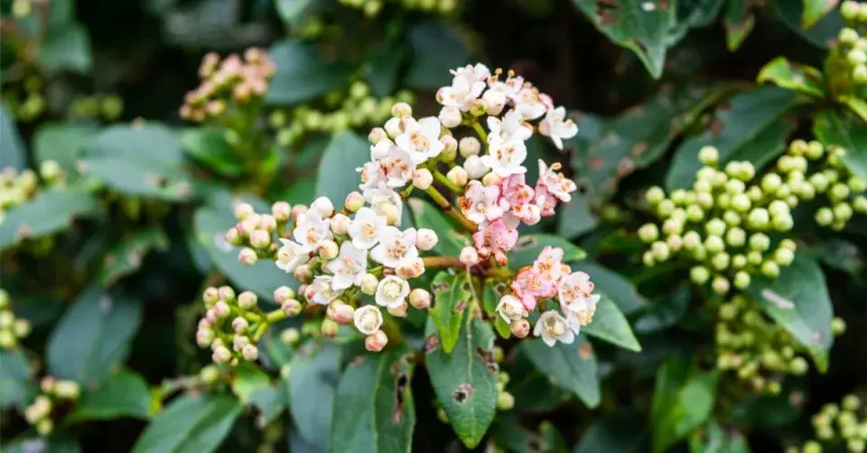 Stálezelenou kalinu středozemní (Viburnum tinus) můžete vysadit na slunné nebo polostinné místo. Po časně jarním kvetení ji ozdobí dekorativní kovově lesklé plody. Výšky sotva 1,5 m dosahují kultivary jako ’Gwenllian’ (na fotce) a ’Ladybird’.
