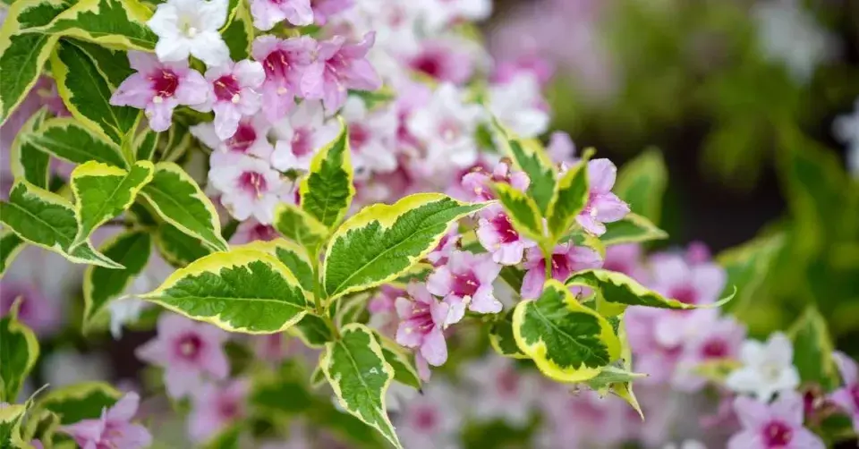 Závoj květů nad žlutě a bíle lemovanými listy dává kompaktní odrůdě vajgélie ’Nana Variegata’ atraktivní vzhled. Po květnovém kvetení přichází druhá vlna bílo-růžových květů – v červenci.