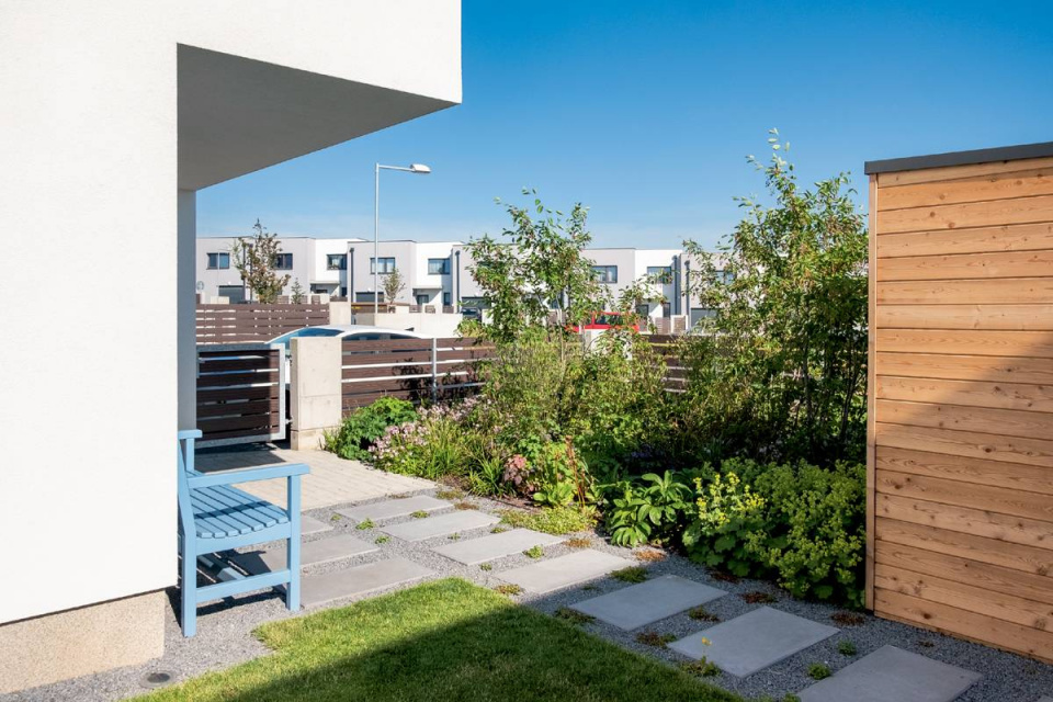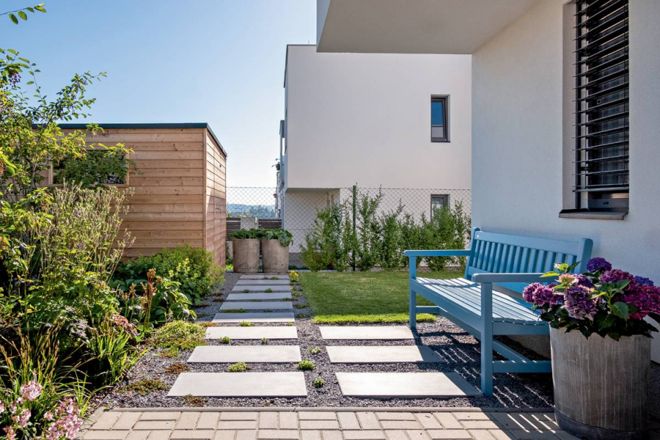 Lavička s vyhlídkou do zeleně na stinné straně domu.