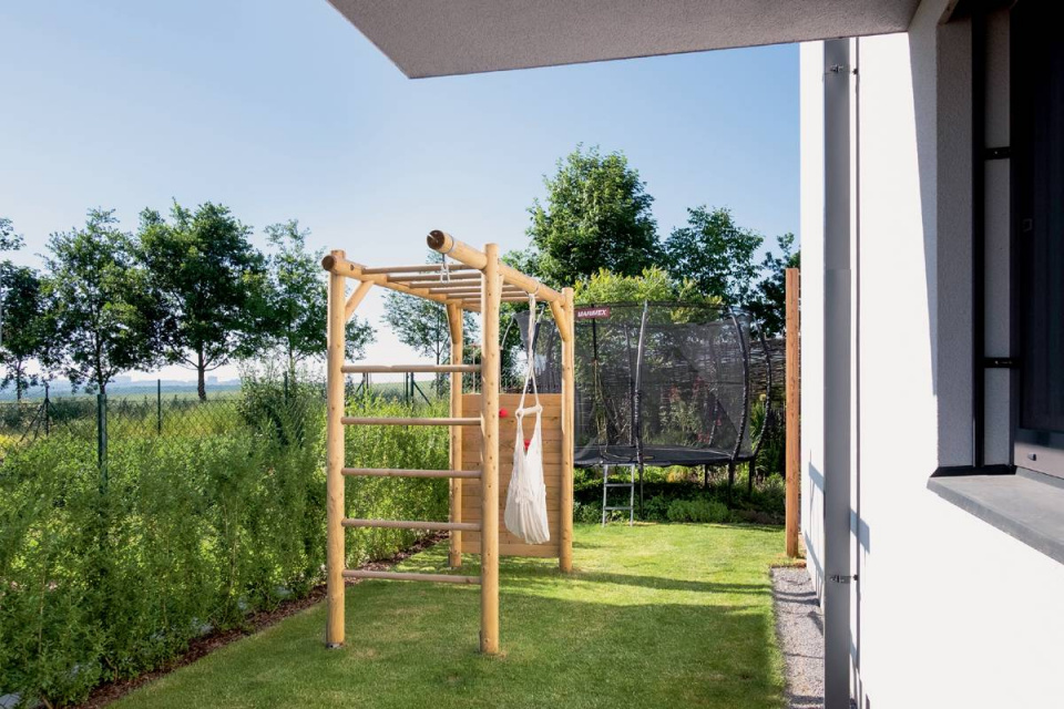 Od stolu je vidět na místa vyhrazená dětem: pískoviště a trampolínu.
