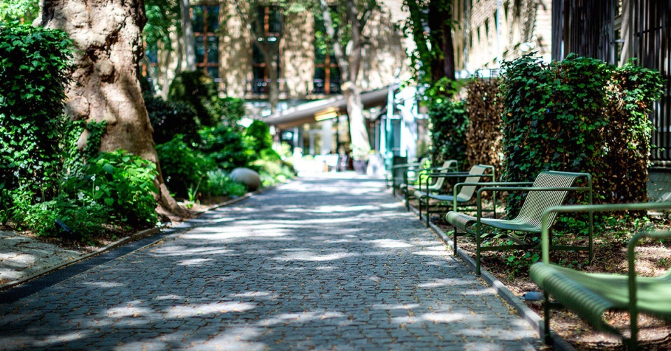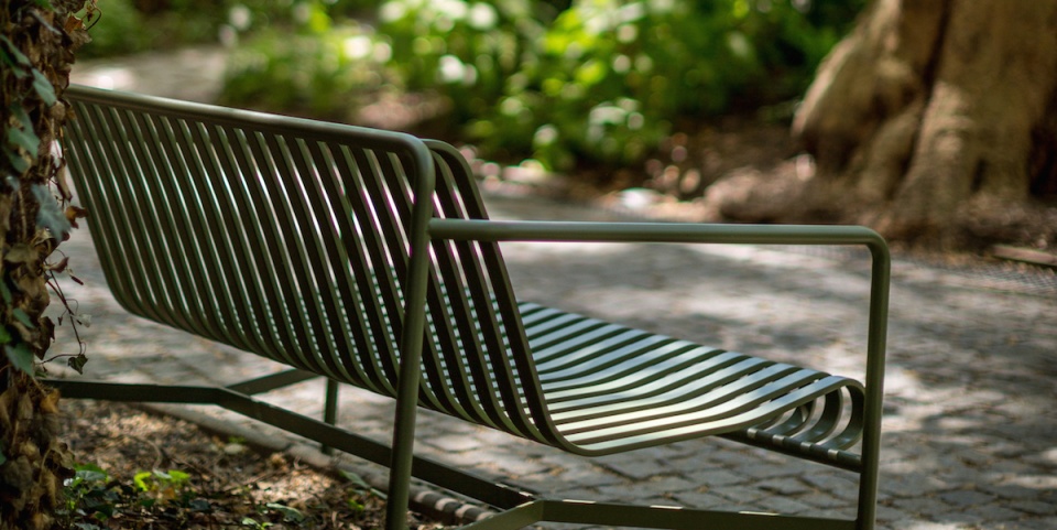 Ke spočinutí v zahradě láká nespočet kovových laviček.