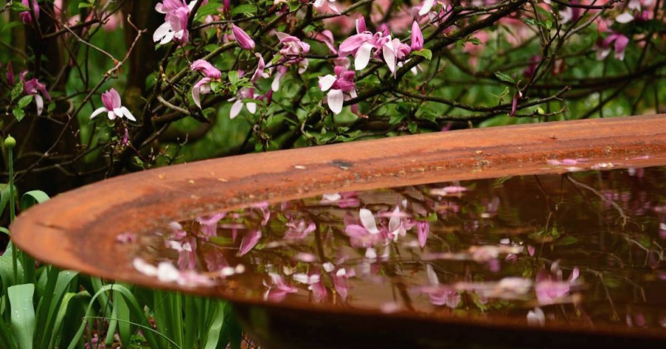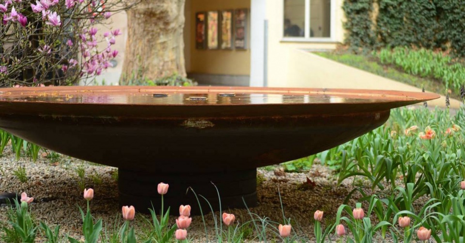 Obří mísa s vodou je protiváhou blyštící se skulptury.