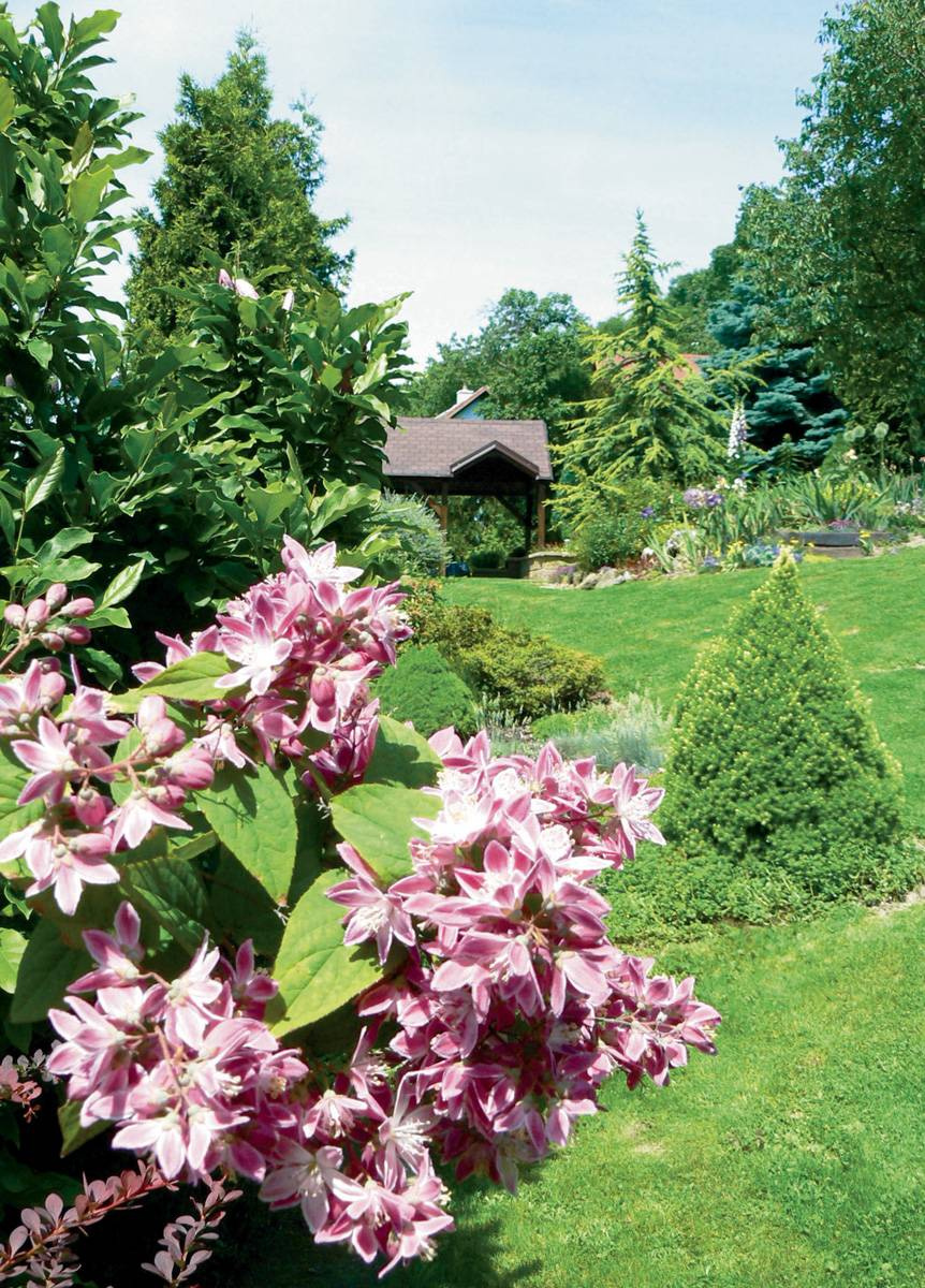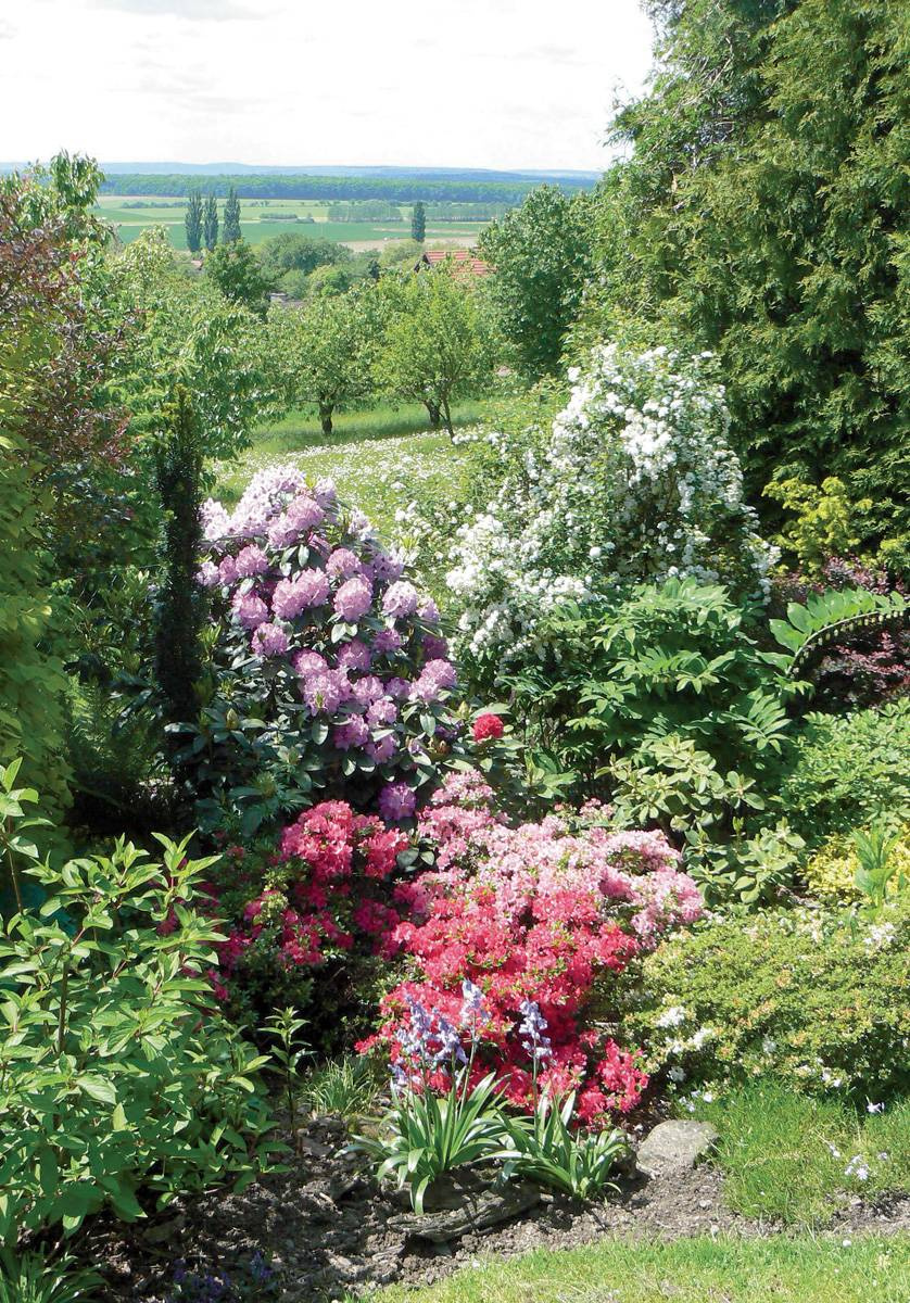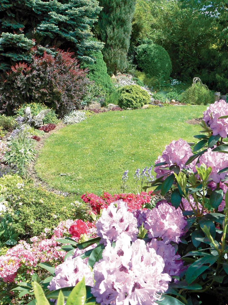 Od sousedů je zahrada oddělena tújemi a také skupinou rododendronů a azalek.
