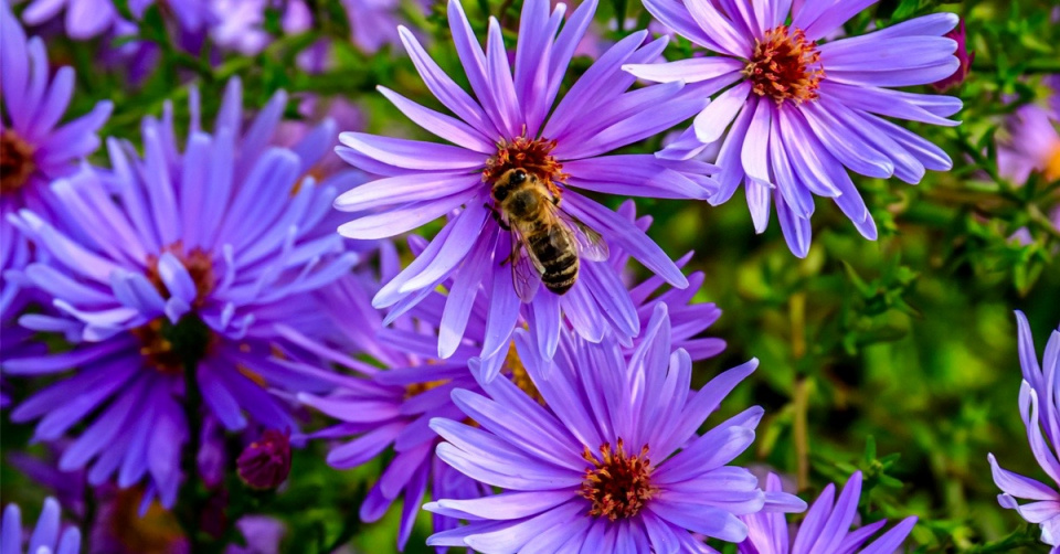Různé druhy podzimních hvězdnic (Aster) se střídají v kvetení od září až do mrazů. Pro včely jsou zdrojem pylu i nektaru – s postupujícím podzimem stále vítanějším, protože o potravu začíná být nouze.