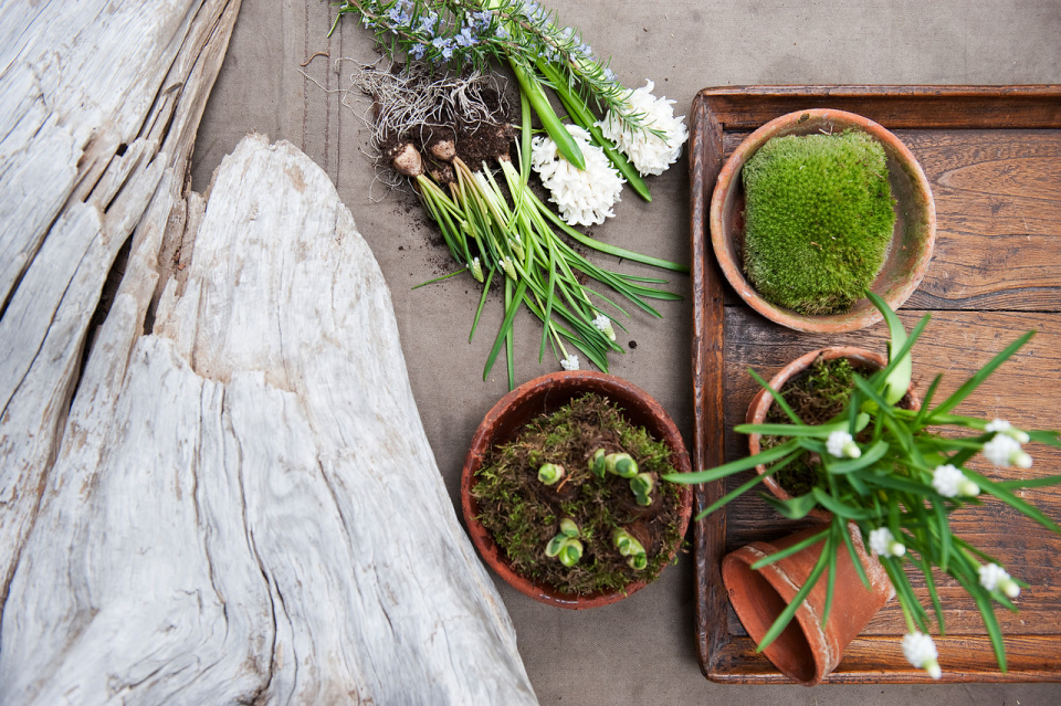 K jarnímu aranžování cibulovin toho nepotřebujete moc: stačí vybrané rostliny, mech, nádoby, případně pár pěkných kamenů, šišek nebo větví...