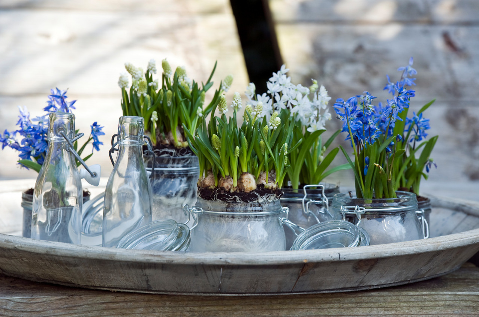 Často využívanými nádobami jsou při aranžování jarních cibulovin sklenice, které rostlinám a jejich květům nijak nekonkurují.
