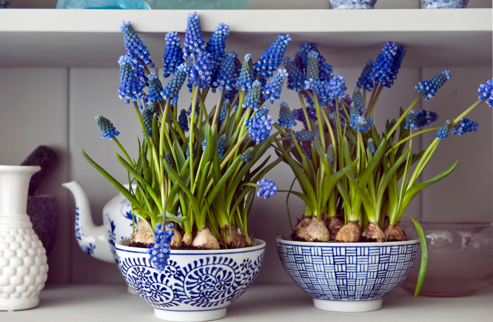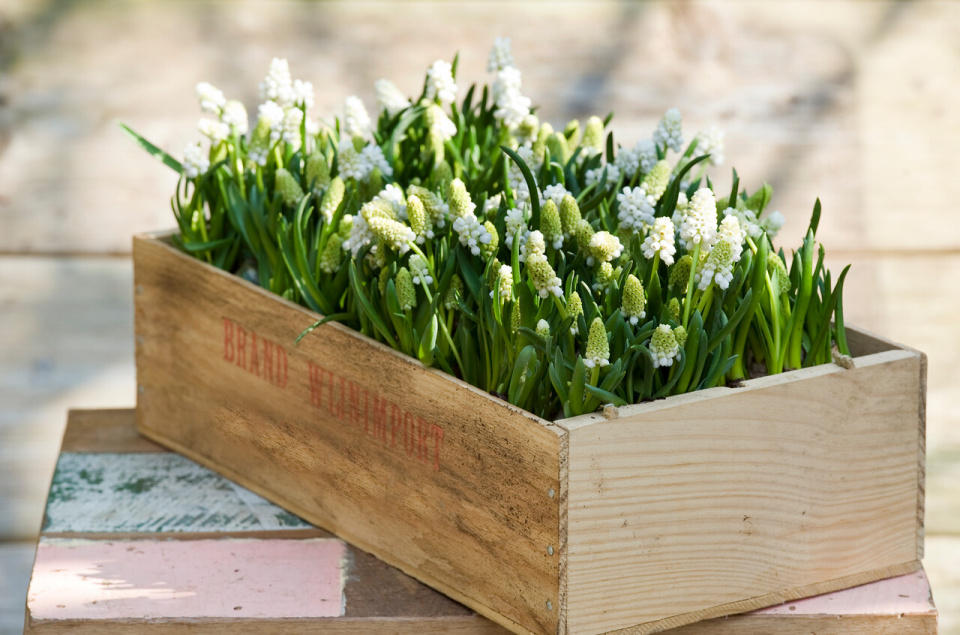Květy modřenců ale vyniknou i v kombinaci se dřevem.