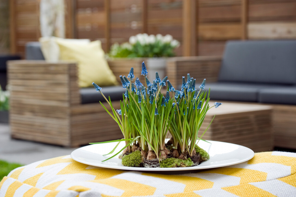 Mech je oblíbeným materiálem floristů. Využít ho můžete i při aranžování rozkvetlých modřenců. Stačí ho jen mezi cibule rozložit a navlhčit.