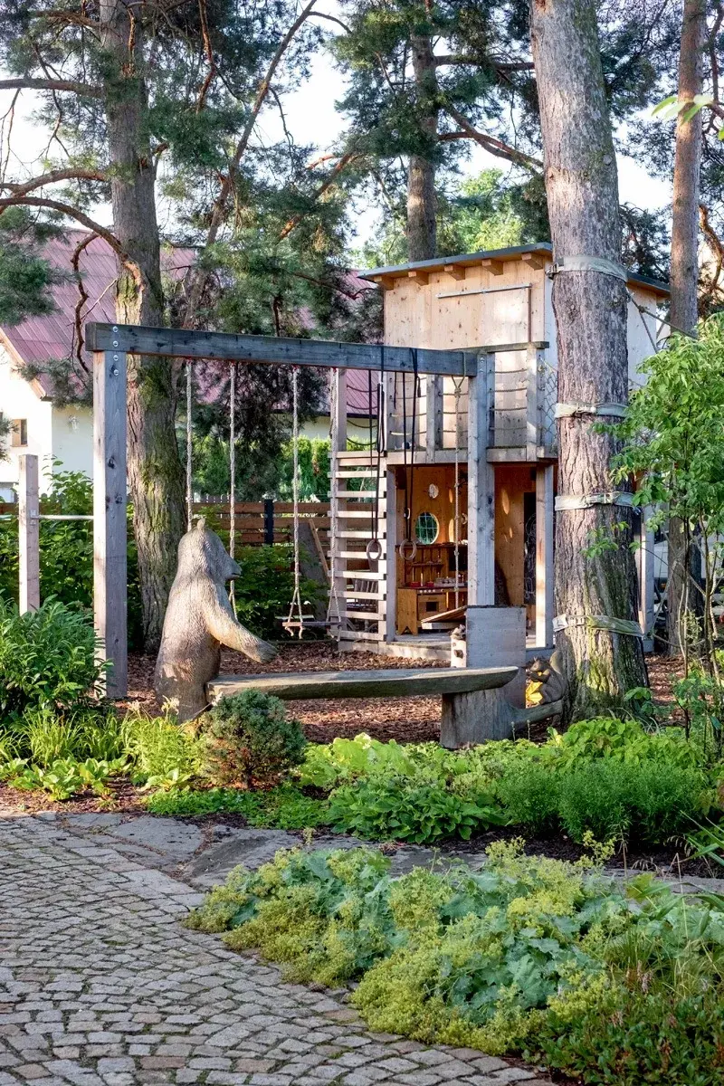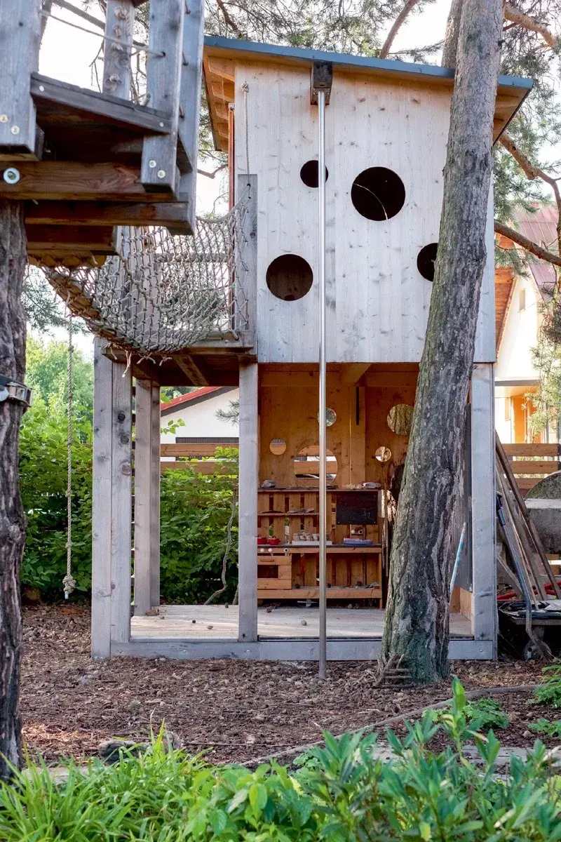 Herní kout schovaný mezi stromy je zdravě vzdálen od rodičovského dohledu. Přesně tak, jak to děti mají nejradši.