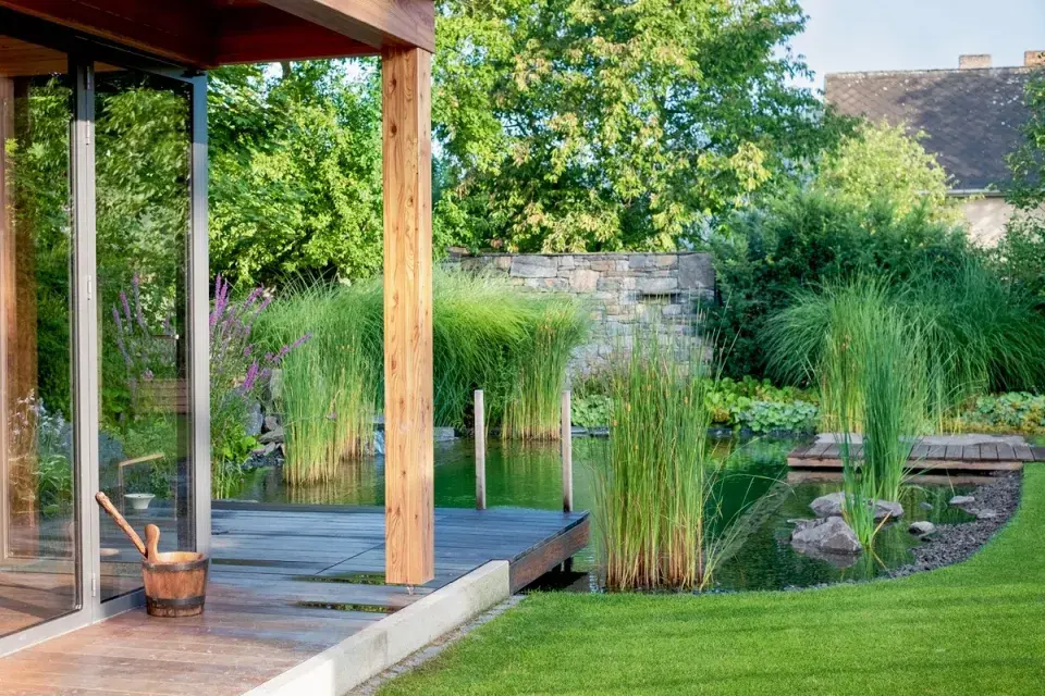 Koupací a „saunovací“ zónu dělí od sousedů kamenná zeď.