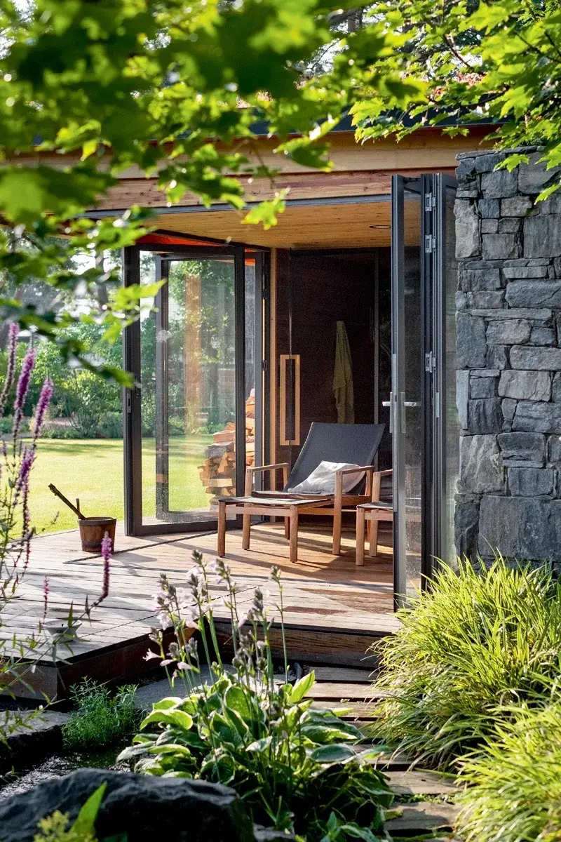 Z roztopené sauny rovnu do vody... A když kamna nehřejí, příjemně se tu sedí s vyhlídkou na hladinu.