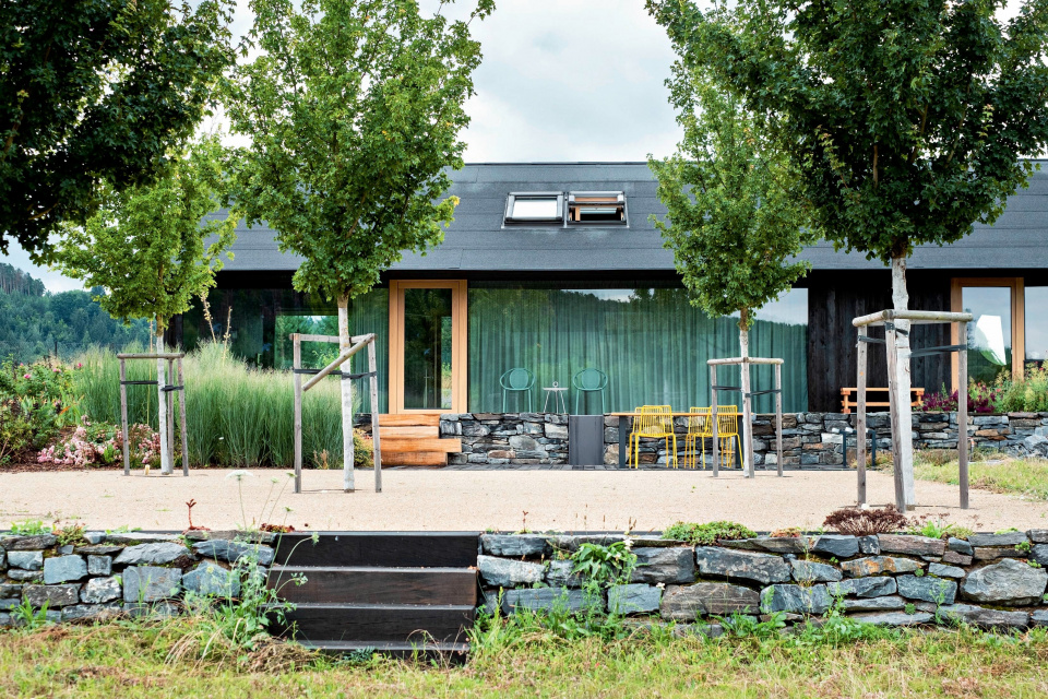 Ze sezení před domem se otevírá vyhlídka k dalekému obzoru.