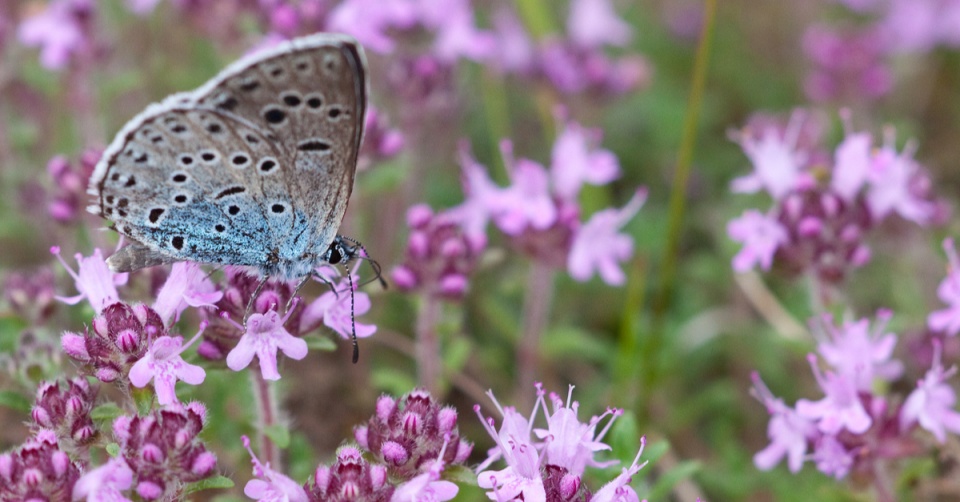 Modrásek černoskvrnný (Phengaris arion) na mateřídoušce (Thymus)