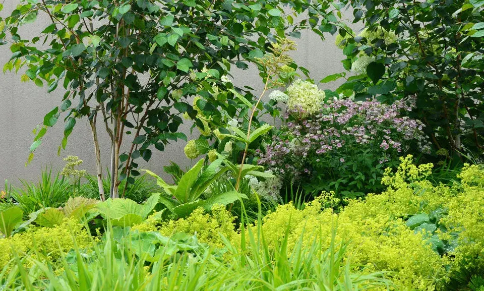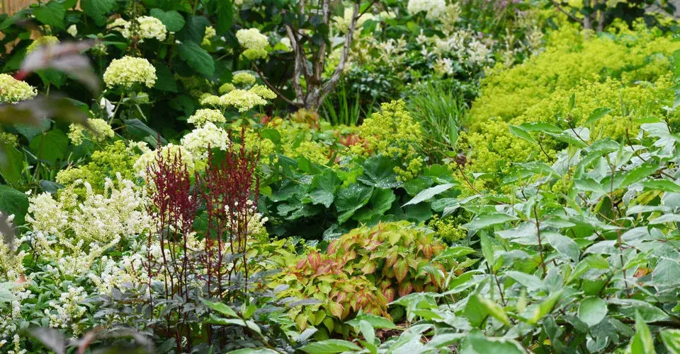 Polodivoká, přírodnější výsadba obsahuje hlavně podrostové stinné druhy trvalek a trav, doplněné keři hortenzií a svíd, čímž vytváří kontrast k přísně organizované pobytové části.