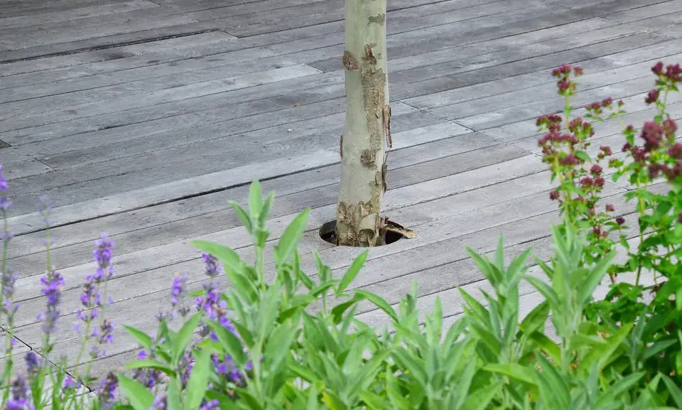 Dřevěná paluba je dosti velkorysých rozměrů, neboť je v ní zabudována zelená pergola z platanů.