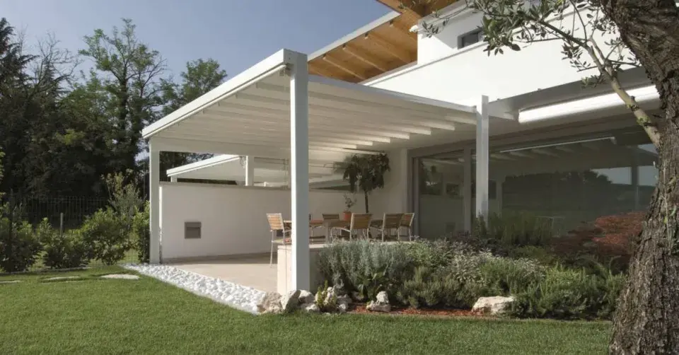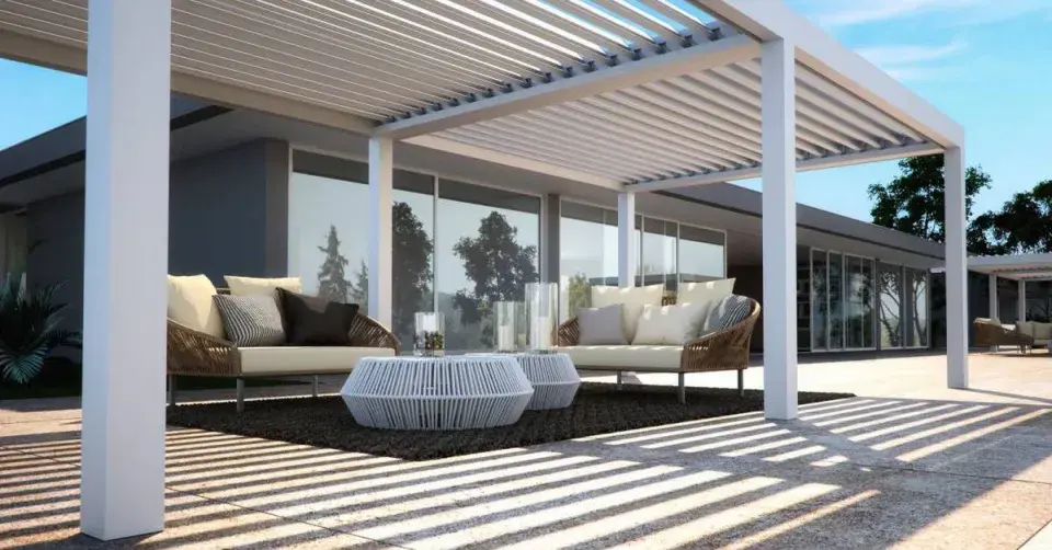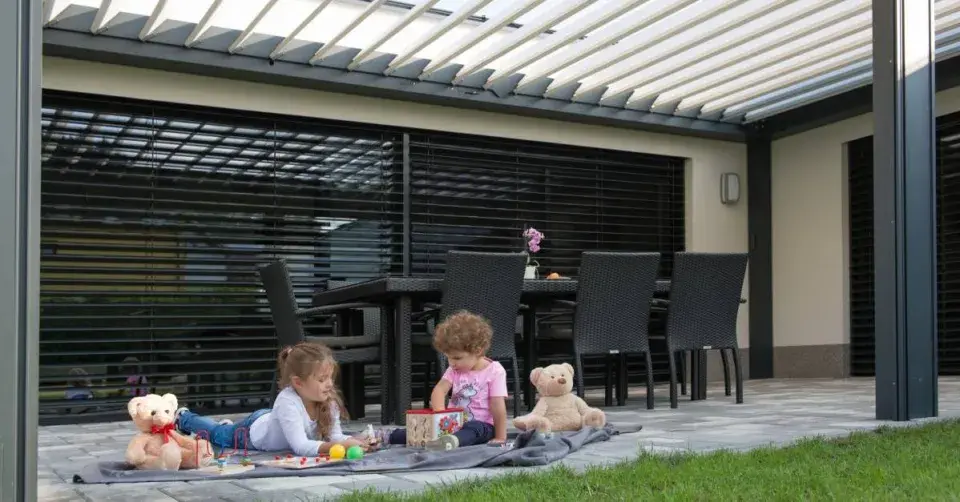 Hliníková bioklimatická pergola funguje bezchybně za jakéhokoli počasí. Lze ji zútulnit mnoha doplňky a vytvořit si venku druhý domov.