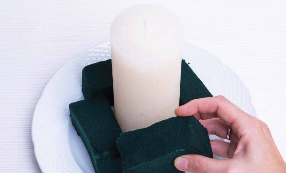Připravte si hluboký talíř nebo misku a do středu postavte svíčku. Je dobré zvolit masivní a stabilní, aby se nepřevrhla. Kolem svíčky položte čtyři kusy (předem namočené) aranžovací hmoty.