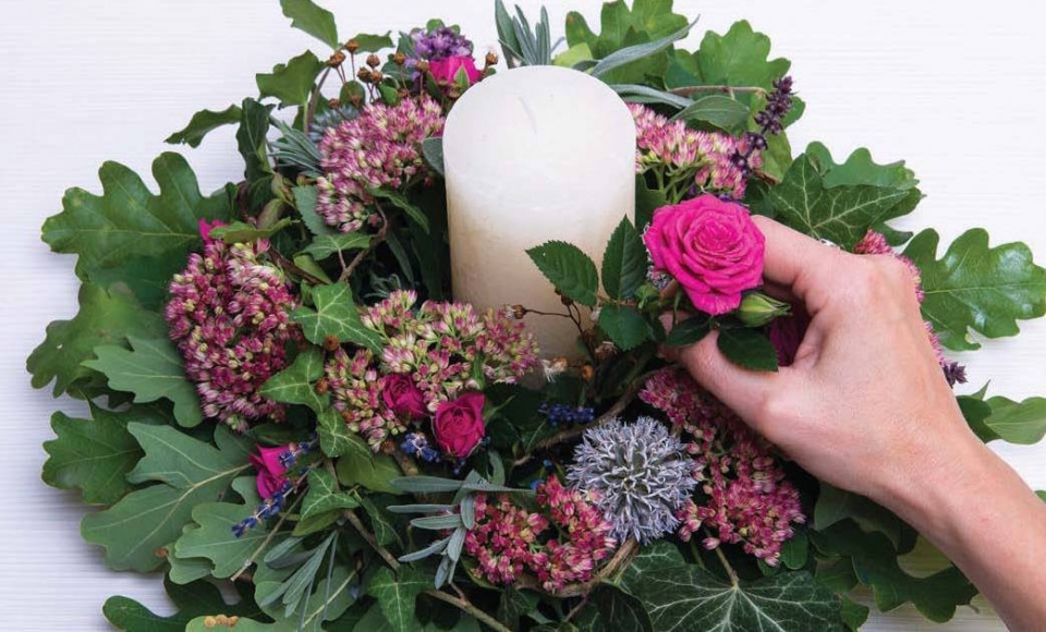 Do aranžovací hmoty zapíchejte nejdříve všechny zelené dekorace, tzn. dubové listí a bylinky a vše obkružte šlahouny břečťanu. Zeleně nesmí být příliš, aby zbylo místo na barevné květy.