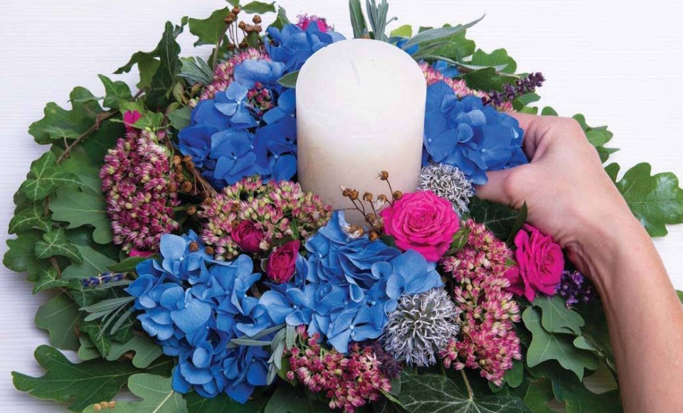 Do aranžovací hmoty dále zapíchejte květy rozchodníku, růže a bělotrnu. Květenství hortenzie bude nutné nastříhat na menší části.