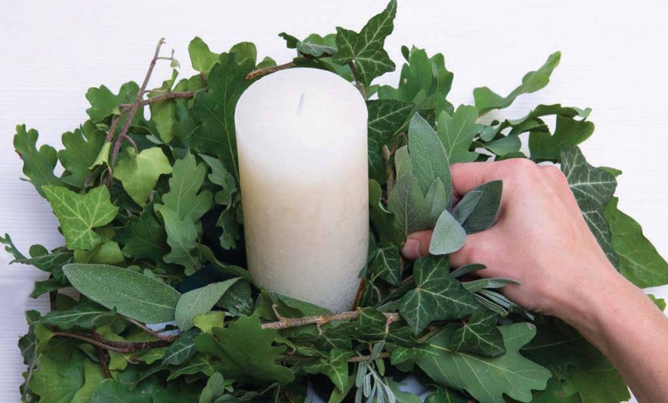 Svícen dozdobte výhony s chmelovými šišticemi a naaranžujte jemné větvičky lnu. Na závěr doplňte hlemýždí ulity.