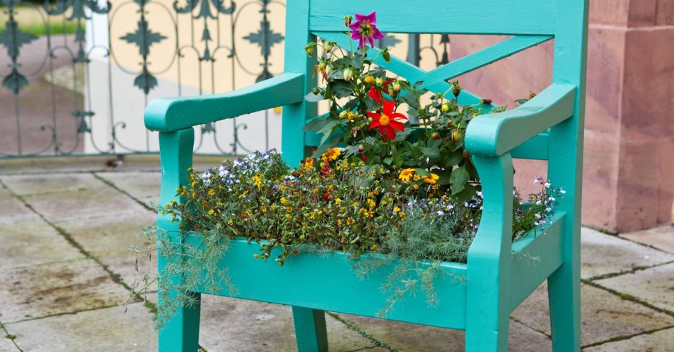 Pokud sedák dřevěného křesla nahradíte prověšeným drátěným pletivem a mechem, na nějž navrstvíte půdu, můžete ho osázet.