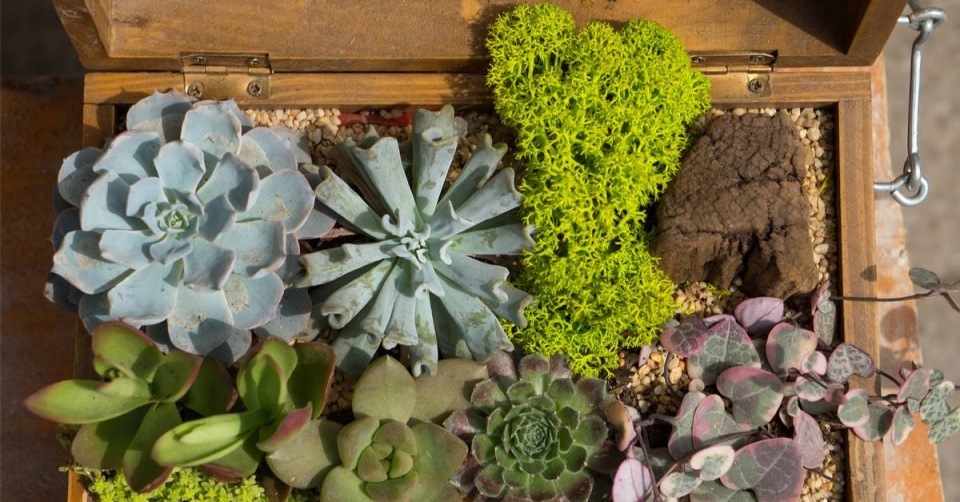 Dřevěná krabička od dárkového balení čaje poskytne prostor několika sukulentům.