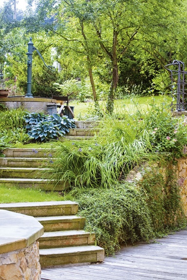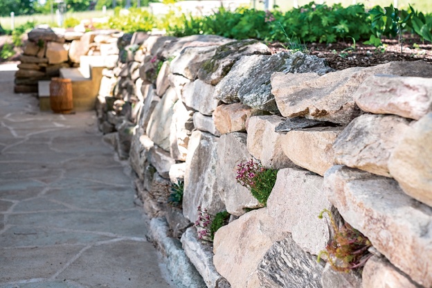 Při výkopových pracích se na této zahradě našlo velké množství kamenů různého druhu. Některé architekti využili na stavbu suché opěrné zídky, kterou následně osázeli bylinkami.