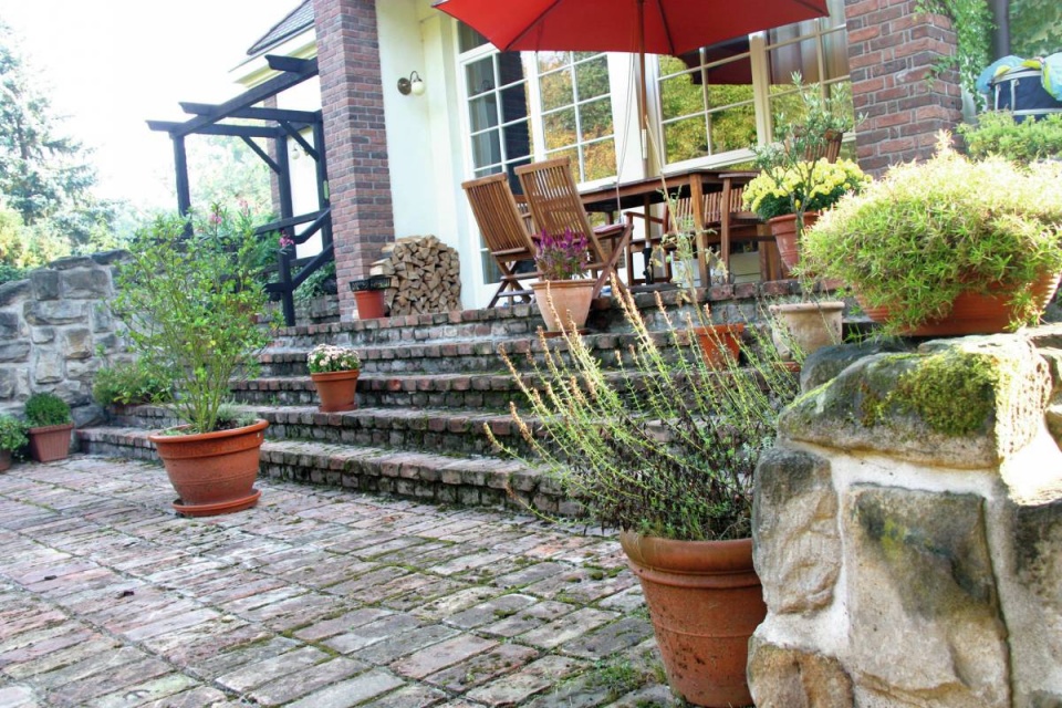 Dvakrát pálené cihly, klinkery, pocházejí ze starého domu. Terasa a schody mají díky nim krásnou patinu.