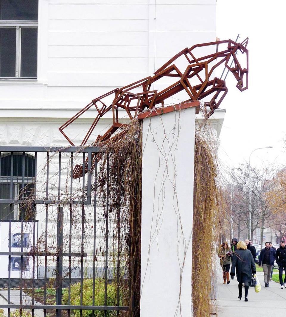 Umění ve veřejném prostoru může i bavit. Tenhle kůň skáče v pražských Holešovicích.
