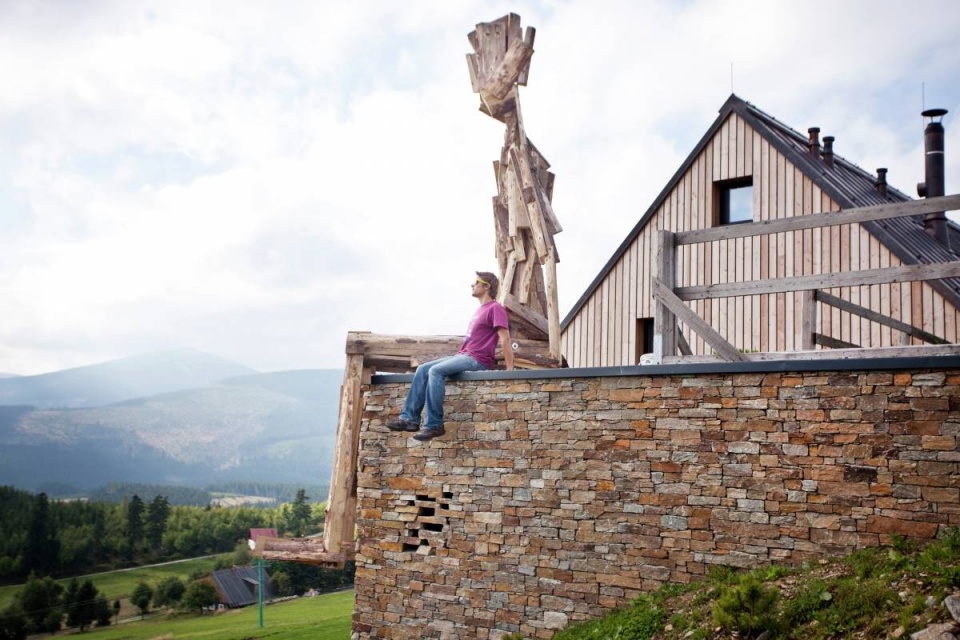 Sedící figura shlíží z kamenné terasy do krkonošského údolí.