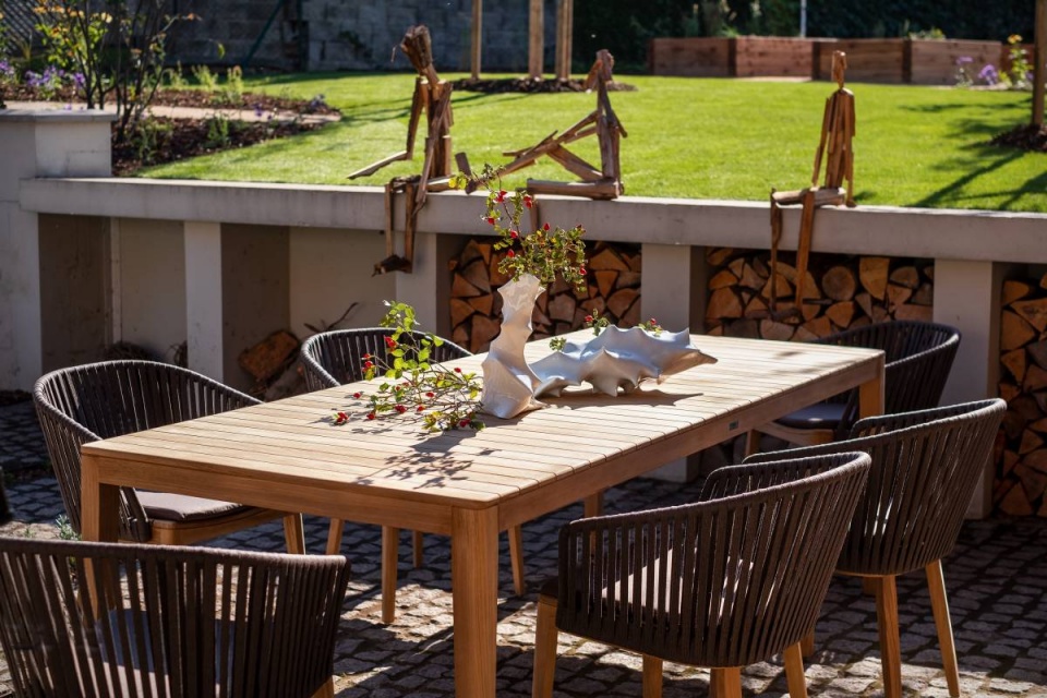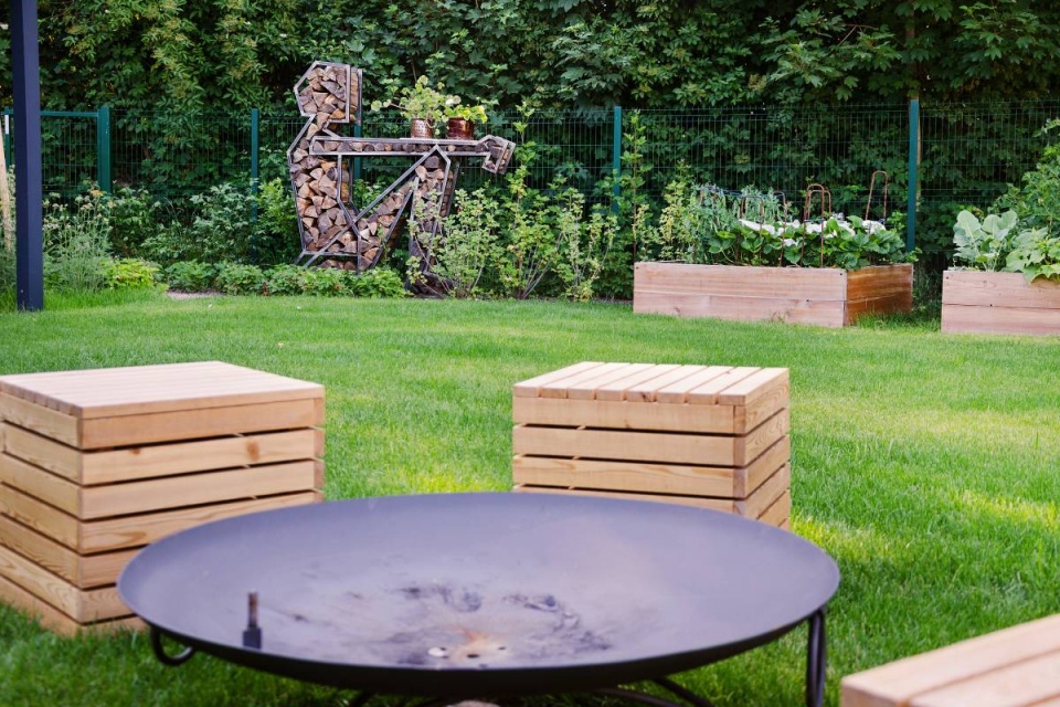 Venkovská zahrada pro tři generace a tři dřevěné figury.