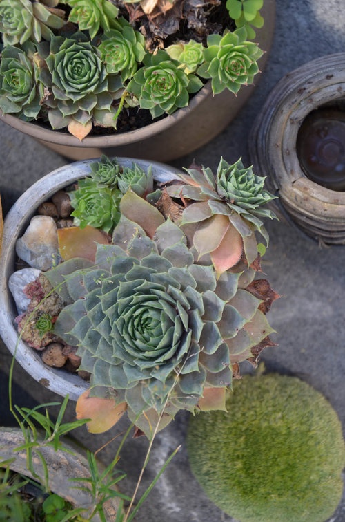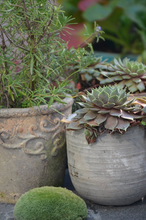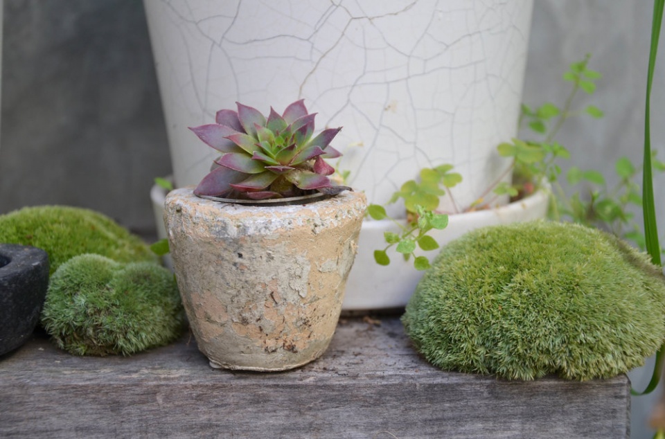 Kompozice s netřesky a mechy se na terase několikrát opakují.