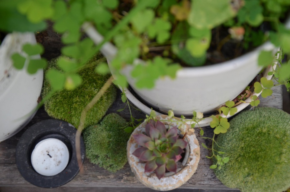 Směs rostlinstva doplňují drobnosti v letním pokoji nepostradatelné – lucerny, svíčky, konve, větve, kameny a mušle z cest, mechy z lesů…