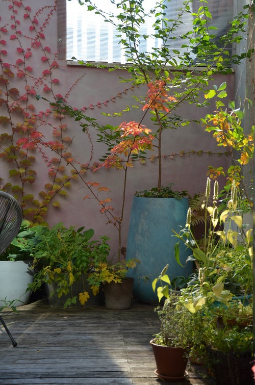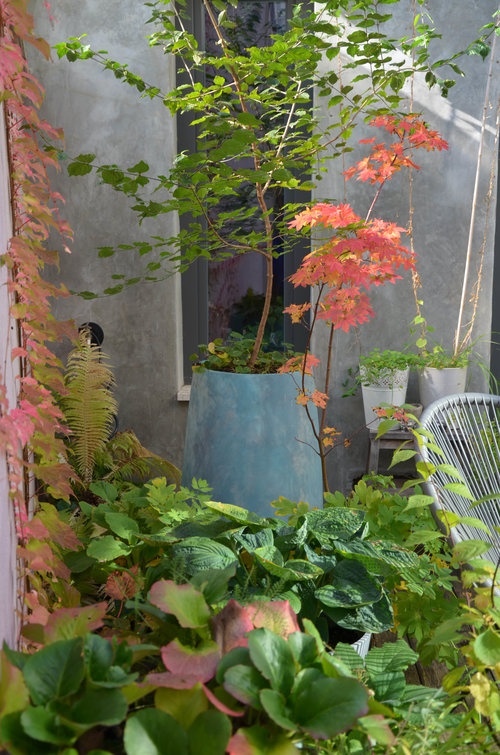 Nástup podzimu dokládá svými barvami přísavník, japonský javor (oba na fotografii) a také traviny zdobené filigránskými latami.