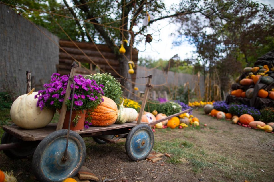Při vytváření dýňových aranžmá využijete různé ošatky a košíky, vhod přijde ale i starý vozík.